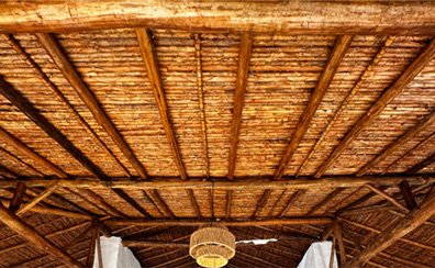 Todo el techo esta techado en teja de barro de chircales locales, caña brava de lado a lado con madera rollisa.
